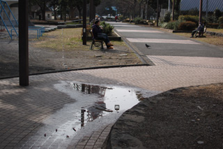 なんだか夢の中のようなへんな風景である。水たまりは湖とかとちがってちょっとの風では波立たない。なのでこれだけきれいに映るんだけど、たまにタイルの目地でぼやぼやするのがまた夢っぽいと思う。