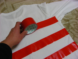 あのインパクトの強いシャツが売っていないか探したのだが、見つけることができなかった。仕方がないので白いシャツに赤いガムテープを貼って自作することで対応。