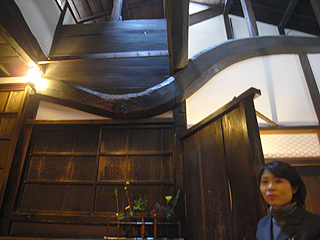 この梁には、元々曲がった木を利用している。北陸の冬は屋根に雪が重く積もるが、真っ直ぐな梁だと折れてしまう。そのため、建物がつぶれないように曲がった木で重みを分散しているのだ。寺が建ってから360年、びくともしない。ちなみにこの造りは、五箇山や白川郷の合掌造りでも見られるそうだ。