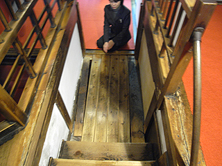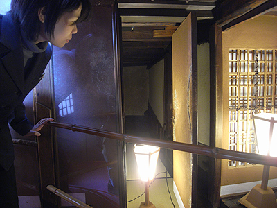 階段の中途から、柵に厳重に囲われた部屋を首を伸ばして覗くと、窓のない圧迫感あふれた部屋が目に入る。「この部屋には4枚の畳。4=死、ということで、ある意味を持つ部屋です…。」