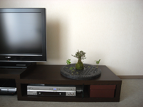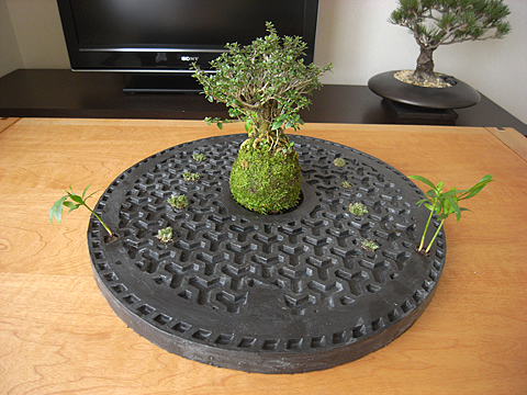 全部の穴にコケ玉、ミズゴケ、ハイドロ植物を置いてみたが、一番外側のハイドロ植物は何だか椰子の木のように見えてきてトロピカルな盆栽になってしまうので、やめたほうがいいと思う。