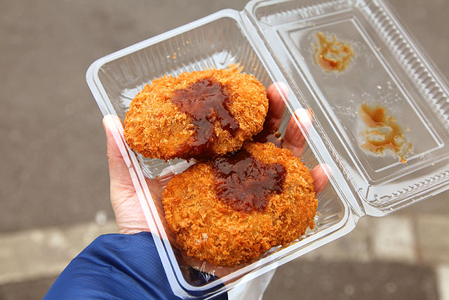 番組ではおばあちゃんが揚げていて、1枚78円だったメンチカツが50円になっていた。二つ買って、多分お孫さんとおぼしき若い店員さんがパックと袋に詰めてくれた。