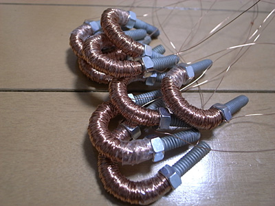 同じ電磁石を靴の裏に均等に仕込むため、8個作ることにした。U字のボルトは磁石的には有利なのかもしれないが巻くにはとても不便だ。ネジの部分がいちいち巻く手に当たって痛い。