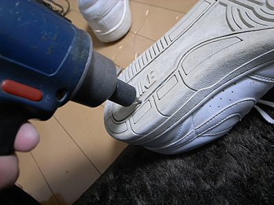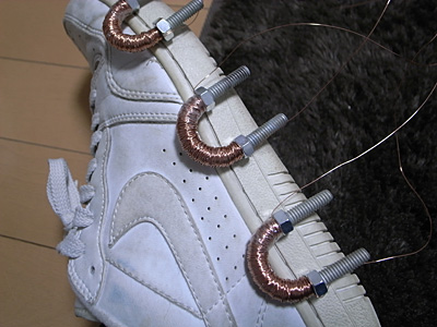 靴底にドリルで穴を開け、電磁石の極を押し込む。これ、ものすごい力作業だった。夜中にやる作業じゃない。