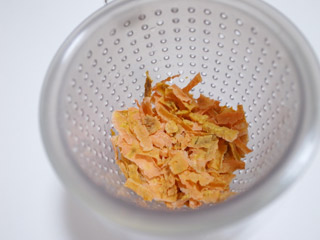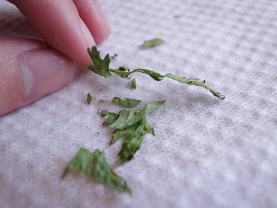 野菜を乾燥させる方法はいろいろあるが、今回は家庭でも簡単に一番短時間でできるであろう方法を採用した。実に簡単な方法だ。ティーにする量ならば大食いチャンピオンがダイエットに励むOLのお弁当をたいらげるよりも早くできてしまう。