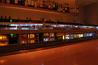 ここ「バー銀座パノラマ新宿店」は、鉄道模型を眺めながら飲める店として2008年11月にオープン。カウンターの前に1周およそ8mの線路が敷かれ、お店の照明に合わせた美しい夜景のなか、毎日さまざまな列車が走っているのを眺めることができます。なんと、ただ眺めるだけじゃなく、自分の車両を持ち込んで走らせることもでき、またボトルキープならぬトレインキープ、つまり持ち込んだ車両を預かってくれたり、展示してある車両を購入することもできるそうです。