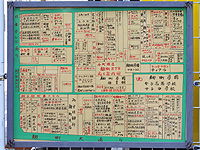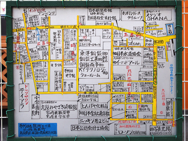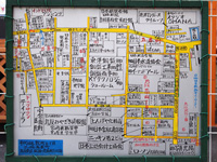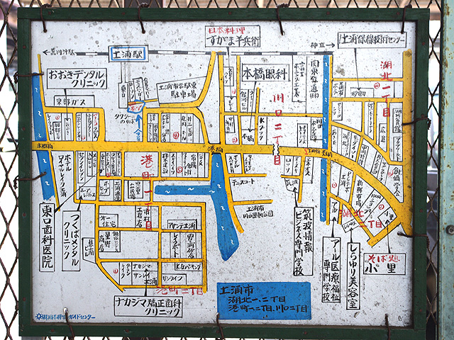 これは茨城県南のターミナル駅、「土浦駅」の東口に設置されているペンキ案内板。茨城にも繁華街にはあるようだ。 中央の道路が思いっきり波線で途中省略がされていて、田舎のスケール感をにじみ出させる。(やたら医療関係の広告が強調されているのはなぜだろう)
