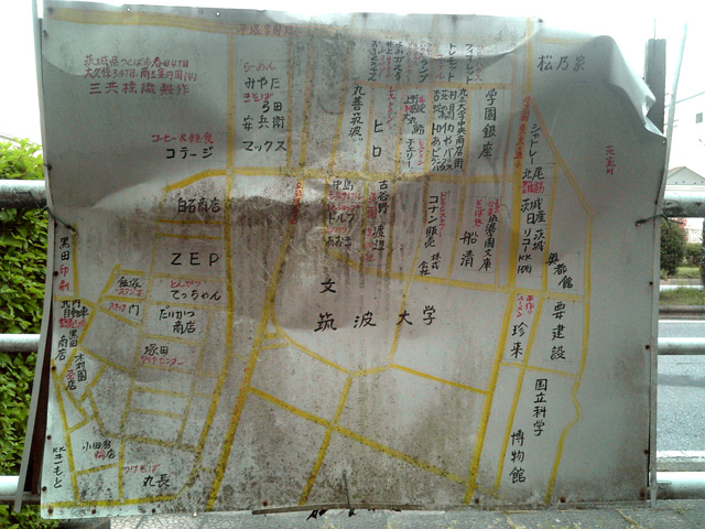 最後、僕がいま住んでいる、茨城県のつくば市にあった案内板。 先般の安藤さんの記事にあったとおり、大学付近は半分くらいが謎の土地か畑で、この案内板の中身もこれまでに比べて情報密度が薄く、従前のものとは一線を画す感がある。内容ももう10年以上前で、半分くらいの店が現存しない。 製作した会社は、これまでと違う会社、「三共標識」。地元の会社なのかな? と思ったら、