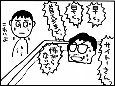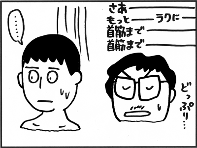 「意識が薄れてゆくでしょう?それが気持いいんですよ!」 「もっと浸かって!もっと深く!」 こんなに「風呂場で意識を薄れさせる」ことを熱心に奨励する人を初めて見た。 尾張さん、恐い。