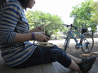 店を出て少し走ると、思いがけず、自然を生かした里山のような公園を近くに見つけた。すごく得した気分だ。人もまばらなのが何よりいい。そこのベンチで、例のうどんフォーメーションのセッティングである。