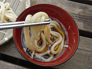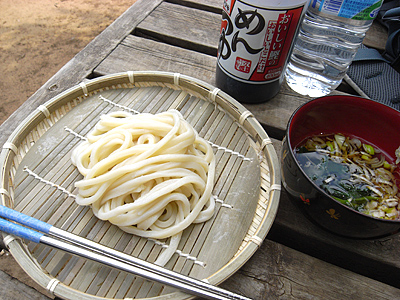 つるっとしたしなやかな麺ではなく、太くてごつく、アグアグと噛んで食べるのがこのうどんだ。ここのお店のは白いほうだが、もっと黒っぽい麺を出す店もある。讃岐うどんのようなのも好きだが、こういう素朴な力強さも好きなところである。「食べた!」という満足感がすばらしい。 サイクリング中の食べ物は、油っこくなく消化のいい、麺類などが適しているというから、このツアー自体、理にかなっているといえよう。別の面でその倍くらい理にかなってないかもしれないが。