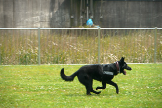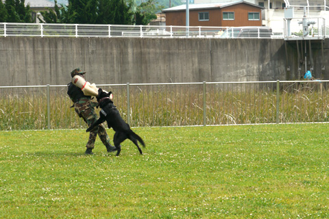 ギャー! 噛みついたが最後、全然はなしてくれないんですよ、この犬。痛いだろうなー……。軍用犬だからそれでいいのか。