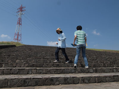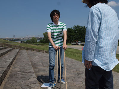 たまたまこの日は川原の草を処理する日だったみたいで、草が綺麗に刈り取られている。ちょうどいい。そこに長さ1m、太さ2cm位の棒を突き立てる。 |