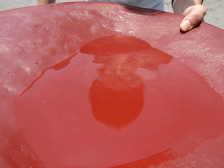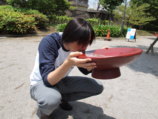 直径は30センチ弱くらいあるこの大盃、1リットルの水も余裕で入りそうだが、あんまり入れすぎても飲みきれない(たぶん飲んじゃダメな成分が溶けてそう)なので、400mlほど注いで、ぐっと飲んでみた。
