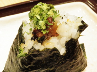 ごはん+生ものと言えば「寿司」が真っ先に思いつくが、こんな風におにぎりになっているのも嬉しい。お弁当では持ち歩けない、おにぎり専門店ならではの食材だ。