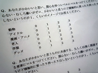 こうした「かわいい」の「ジャンル」+「属性」にどれほど皆さん「かわいい!」と反応するのか?アンケートを取ってみました。上の項目の中から好きなものに数値0〜3でマルつけてもらう形で、ゼロは「興味なし・むしろ嫌い」、1が「かわいいとは思うけど特別行動は起こさない」、2と3が「結構好き」「かなり好き」といった感覚でつけていただいてます。 |