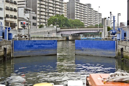 すっかり東横堀川のファンになったぼくだが、この大阪の河川は閘門に特徴がある。以前記事に書いたことがあるが、閘門というのは水位の異なる河川を船が往き来するための仕組み。2つの水門に挟まれたところに船を入れ、出ていく水位に合わせるというもの。って、この説明じゃよく分からないか。えーと、宇宙船の減圧室みたいなもの?もっと分からない?