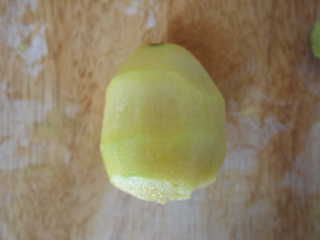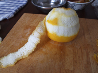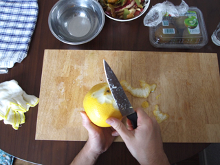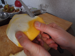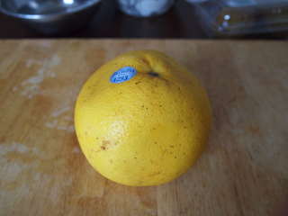 さて、ここまでやってみて気づいた点として「皮をむいたら食べなくちゃいけない」という問題があった。 一日のスタートはフルーツで。けっこうな話だが、そう何個も食べられない。 というわけで、むいても中身がでてこない、皮の厚いフルーツで練習することに。グレープフルーツである。 皮が厚い分、むき応えも充分だ。