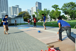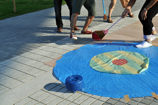 漬け物石カーリングは石を転がして円の中に入れるスポーツで、どれだけ中心に近い所に石を置けるかを競います。