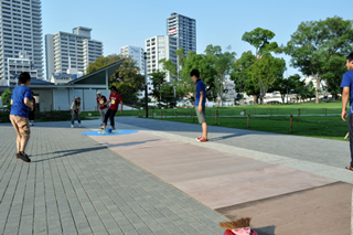 みんなの様子を見ていると滑る靴はバランスを保つのが難しく投げづらそうだったので普通の靴でいく。先取点はやれない。手堅く円に入れにいくぞ。
