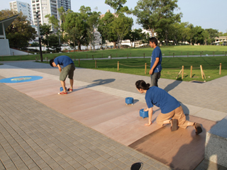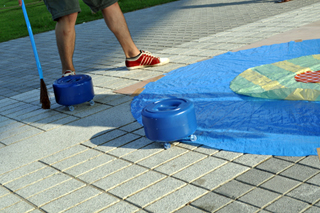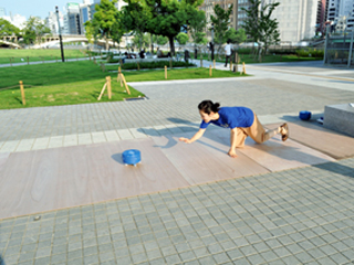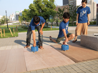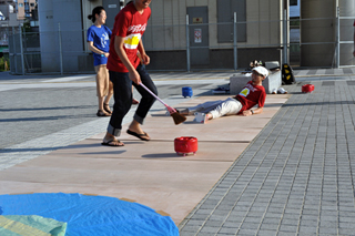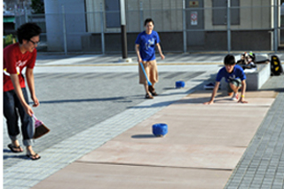 滑る靴を履いたり、強弱を付けてみたりと試行錯誤するも入らない。弱すぎると車輪が向きを変えコースアウト、強すぎるとそのまま通り過ぎてしまう。予想以上に難しいぞ、漬け物石カーリング。