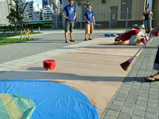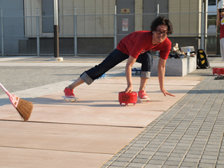 カーリングでは投げた後に滑る先をこすると氷が溶けて距離が変わるのですが、漬け物石カーリングの場合、特に意味はありません。強いて言うなら、応援ですね。