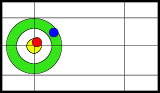 二点差で互いに残り一投のため、今入ってる石をはじき出せば勝利が確定ですね。ここは石を入れに行くよりもはじき出す事を考えた方が良さそうです。