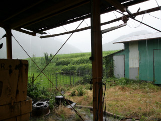 旧大野見村役場の前で昼食を取った後、再び四万十川に沿って歩く。途中、思わぬところで沈下橋を発見し、思わず小躍りしてしまったが、その次の瞬間、またもや土砂降りの雨が降ってきて、私は近くの資材置き場に駆け込んだ。