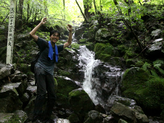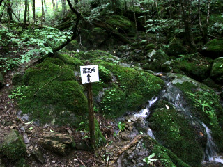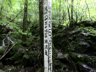 ところで、源流点を良く見ると、水は上方から流れてきており、まだ先がありそうな気がする。岩の間から水が染み出てくるような、本当の源流点へ……いや、これ以上は道が無いし、岩も濡れて危険なので、深追いはやめておくとしよう。源流点のポールが立っている、ここが源流点なのだ。