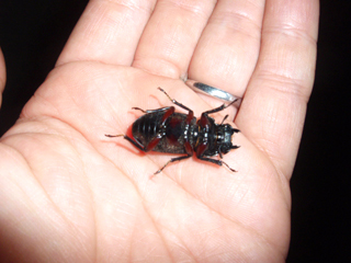 たいして明るくもない場所でアカアシクワガタのメスを発見。 「プリン」と名づけて持ち帰ることにした。