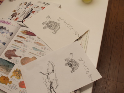 ハガキ大の用紙に魚の絵と説明をひたすら描き、最後に製本する予定でした。たくさんの魚を描きたいと気合いを入れ過ぎて、8月半ばで「ア」がつく魚ばかりたくさん描いている事にきづきました。決まった様式などはなく勝手に作る物なのでどうにでもなれとあきらめかけていたところです。