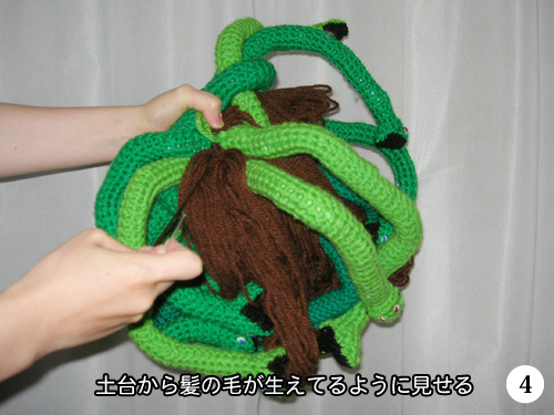 土台に毛糸を縫い付ける。これにより、土台部分が表面から見えなくなり、蛇と蛇の隙間から髪の毛が生えているかのように見せる効果がある。