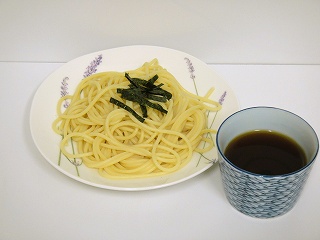 続いてはパスタも同様に食べてみよう。麺とつゆを並べた写真には妙な違和感が。それは、つけつゆと組み合わせるには見たことのない太さの麺だからだろうか。