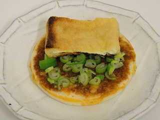 ネギと油あげを乗せて作った、きつね風めんつゆピザ。ラーメンスープ以上に、めんつゆの和風のにおいが漂ってくる勢いがすごい。見た目でも、においの面でも解釈しがたいものができた。