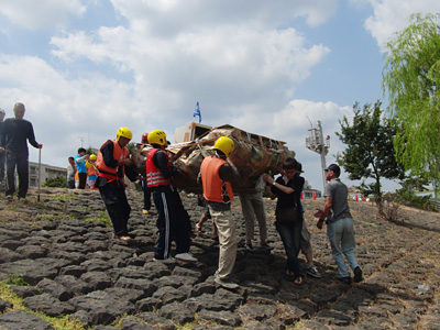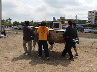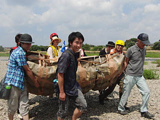 待機場所からスタート地点まで乗組員でいかだを運ぶ。道場主石原さんはいつの間にか道着に着替えていた。
