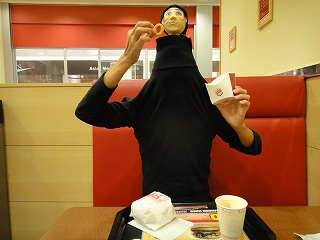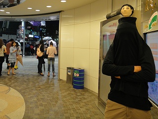 本物の目はタートルネック部分にあるわけだが、全く見えないわけではなく、生地から透けて周囲の状況はなんとなくわかる。ただ、視界がぼんやりして人の目を認識できなくなるのは利点と言える。雑踏にいながら、自分の内面に籠もれるからだ。