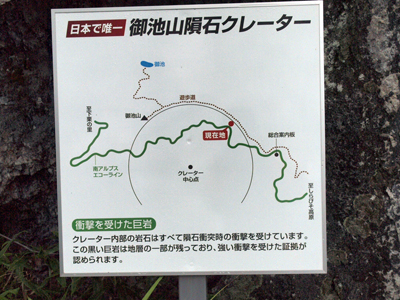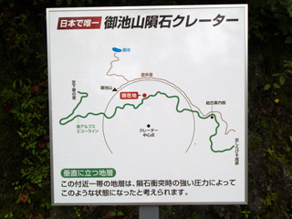 クレーター内を走る林道に沿って進むと、ところどころにこの場所がクレーターである証拠を解説した案内板が出ている。 ただ見ているだけではなんの感動もないのだが、解説を読むと「なるほど」と思う。