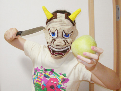「顔が恐ろしいだけあって、包丁を持っても迫力があるに違いない!」という遊び。・・・というか単に梨を切ろうとしているだけ。