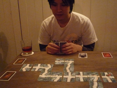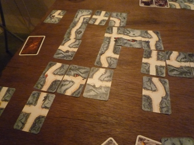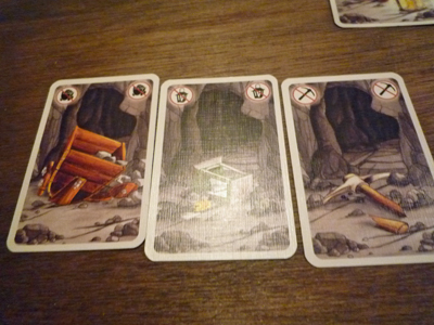 ただ「ゴールの札を一枚だけ見れるカード」というのもあり、それを使えば事前に判別が可能。しかし、それであからさまにゴールに向かってしまうと他プレイヤーから気づかれてしまう。たとえ金鉱掘りという同じ目的でも、自分が真っ先にゴール出来るように出し抜かねばならないのです。