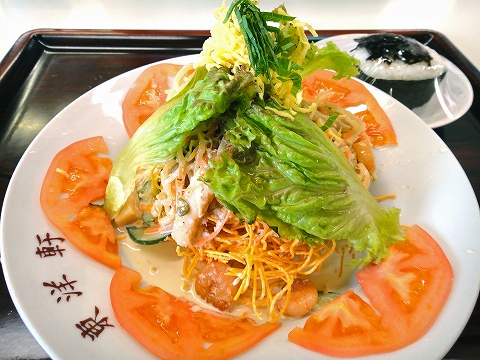 レタスやトマトがふんだんに使われたサラダ。一番上に乗っているのは刻まれたシソと錦糸卵。そのあたりの構成もまあ珍しいだろうか。おにぎりもセットになってついてきた。