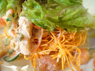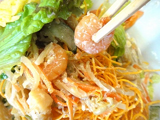 長崎名物、皿うどんの麺だ。あのパリパリした細い揚げ麺である。そこにあんかけではなく、ドレッシングで和えられたモヤシやエビ を乗せて、さらにレタスやトマトで囲んだというメニューなのだ。