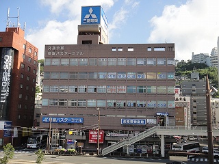 上の左側の写真、この記事の最初に載せた長崎駅だが、そこから反対を向くと「交通会館」というビルがある。一階がバスの発着場になっているタイプのビルだ。