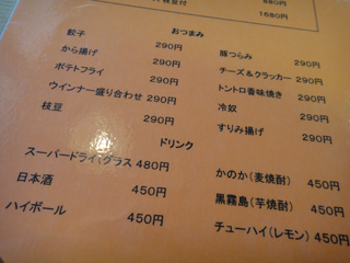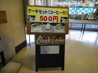 どうやら「Book Cafe」という名前であるらしいこのお店。その名前の雰囲気やケーキセットのアピールからすると、ちゃんぽんからはイメージが遠いが、店の前に大きく掲示してあるメニューでは刺身や枝豆など、思いっきり居酒屋系のものが並ぶ。
