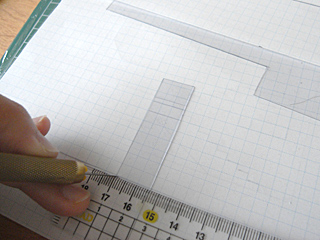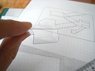 方眼の目の通りに寸法を測って、カッターで壁や階段のパーツを切り抜く。ツーバイフォー工法だ、たぶん。そして言っておくが、相当めんどいぞこれは。