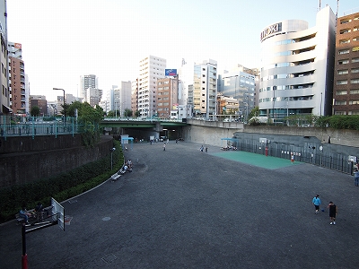 上は公園で、地下の川底では駐車場を建設中の南支川、高速道路な分けじゃないのでちょっと脇道にそれるが、また橋を頼りに、築地のほうに向かってたどっていこう。