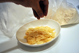 こっ、これは、味付けせず、素材の味を活かして各々の好きなフレーバーを楽しめる、無印良品の素のままポテトチップスウェーブカット(税込み105円)やないかー!でも、フレーバー(味付けの粉)が無い!!