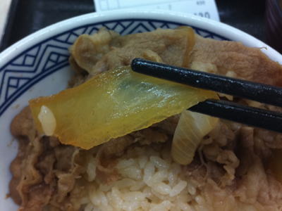 食べてみると、肉の柔らかさはこれまででベストだ。味の濃さは午後7時と深夜2時の中間くらいで個人的にはちょうどいい塩梅。心が牛丼を拒否する逆風の中にあって、文句なしのベスト牛丼に躍り出る1杯だ。