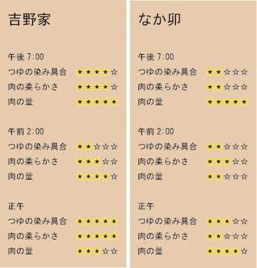 この後午後5時に再び両店舗を訪れてみたが、やはりベストは吉野家のランチタイムの牛丼だった。これは個人的な好みにもよるので、人によっては判断が分かれるところだろう。