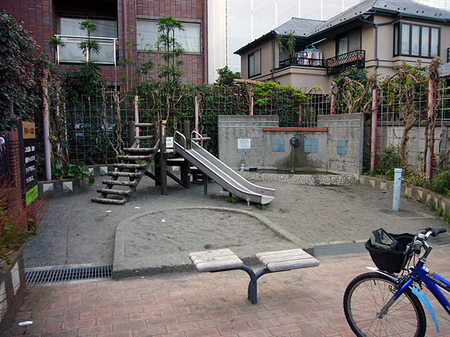 世田谷区立若林4-14広場は、狭い敷地の中に砂場、すべり台、池まで備えた憩いの空間だ。