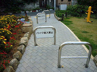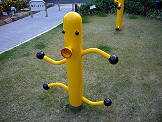 その先、踏切の手前の道を曲がって狭い路地を真っすぐ進むと、世田谷区立若林4-16広場があった。さっきの若林4-14広場が狭いながらちゃんとした公園だったので、若林4-16広場も遊具とかある公園なのかと思ったら、そこに設置されていたのはかなりハードコアな広場だった。